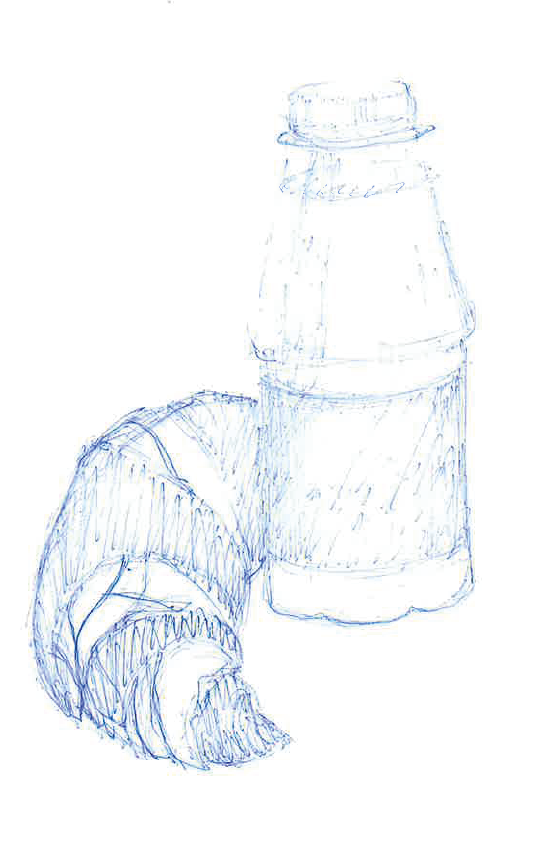 In meiner Schnuppewoche bei DD COM erhielt ich ein Croissant und ein Getränk, die ich auf verschiedene Arten skizzierte und mit verschiedenen Stiften festhielt. Daraufhin habe ich es schrittweise flächig und linear vereinfacht, bis es die Form eines vollständigen Logos annahm.